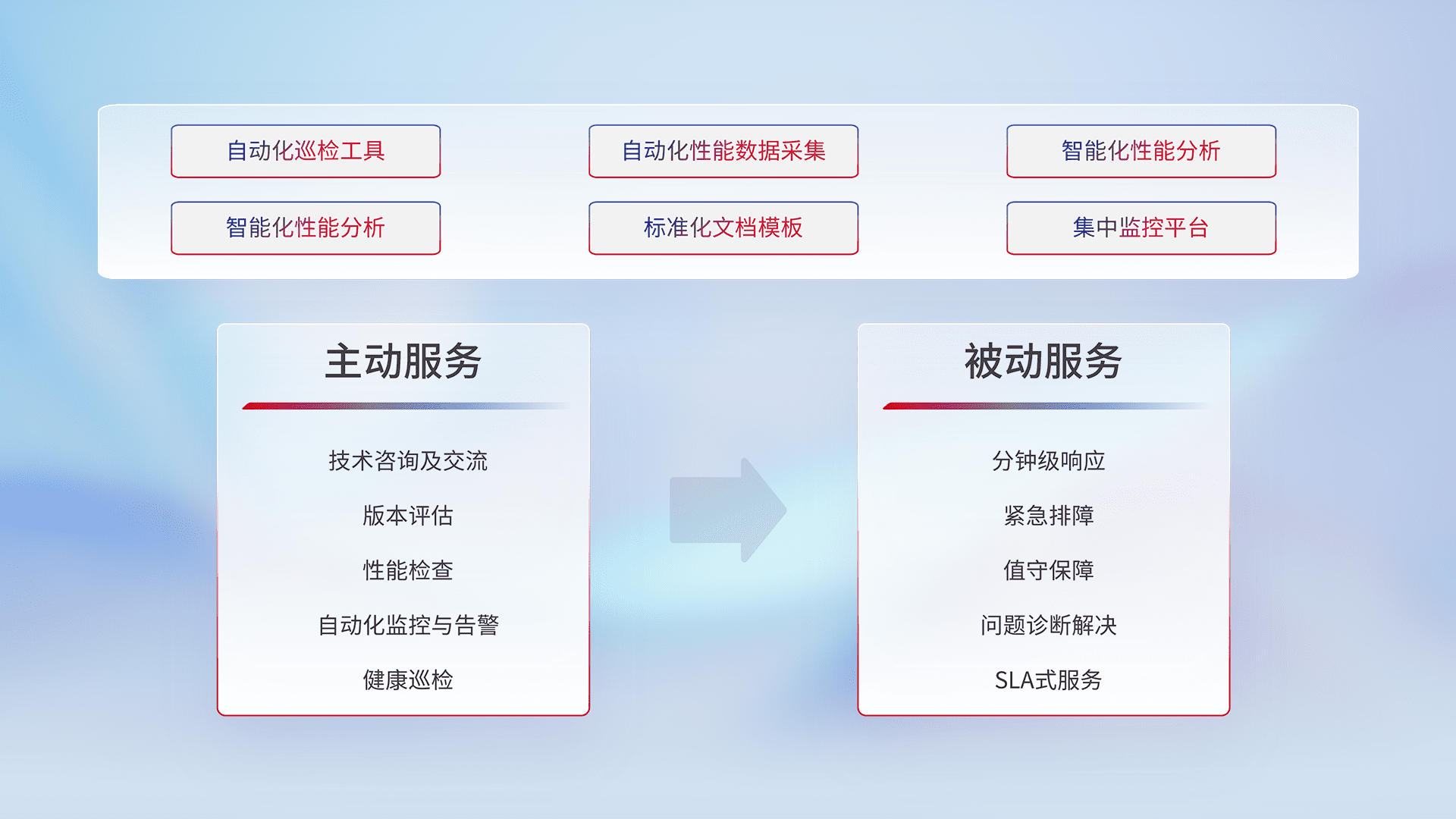 智能化工具和标准化文档,,保障服务质量,,提供主动服务(包含技术咨询、、、版本评估、、、、性能检查、、自动化监控与告警、、、、健康巡检)和被动服务包含(分钟级响应、、、、紧急排障、、、、值守保障、、、、问题诊断解决、、、SLA服务)。。。