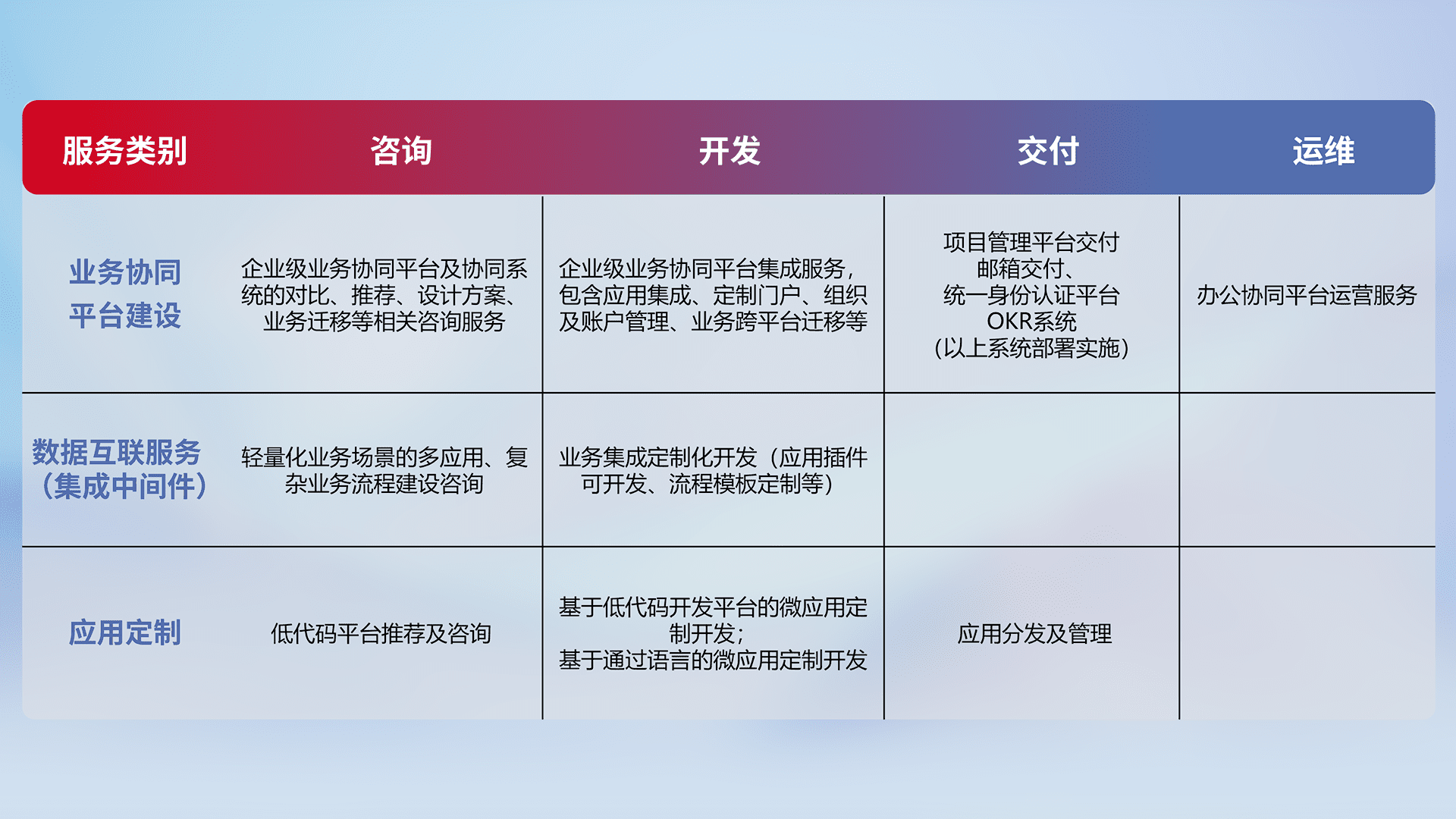 针对钉钉、、企微、、、、IDaas等平台级产品提供产品的规划、、方案、、、交付、、定制化开发等服务,,,实现如统一协同办公、、、、智能客户服务、、、混合会议管理、、智能数据查询、、等业务场景,,,实现数字化转型。。。。